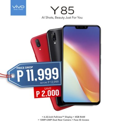 Global smartphone brand Vivo has a treat for its loyal customers: the Y85 is now available for Php11,999 or Php2,000 less its original retail price.The Y series smartphone was first introduced in May. It has a 6.22-inch 19:9 high definition FullView Display with an 88% screen-to-body ratio.