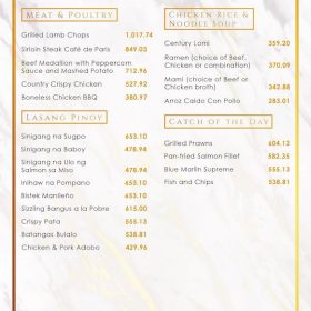 Also on the menu are the savory platters of meat such as Grilled Lamb Chops, Sirloin Steak Café de Paris, Country Crispy Chicken, among others. All these could boost your mood with its lush flavor that lingers on the palate. Be sure not to miss your all-time favorite Filipino cuisines and Asian-inspired delicacies giving you a variety of tastes best shared with the family at home.
