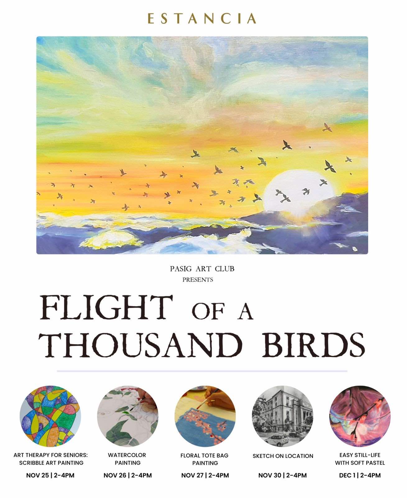 The Pasig Art Club recently launched a collaboration with author Romualda Manalo-Guirriec with a book entitled Flight of a Thousand Birds. Admire the book’s art pieces from November 23 to December 1, 2022 at the 3F East Wing of Estancia Mall, Pasig City!