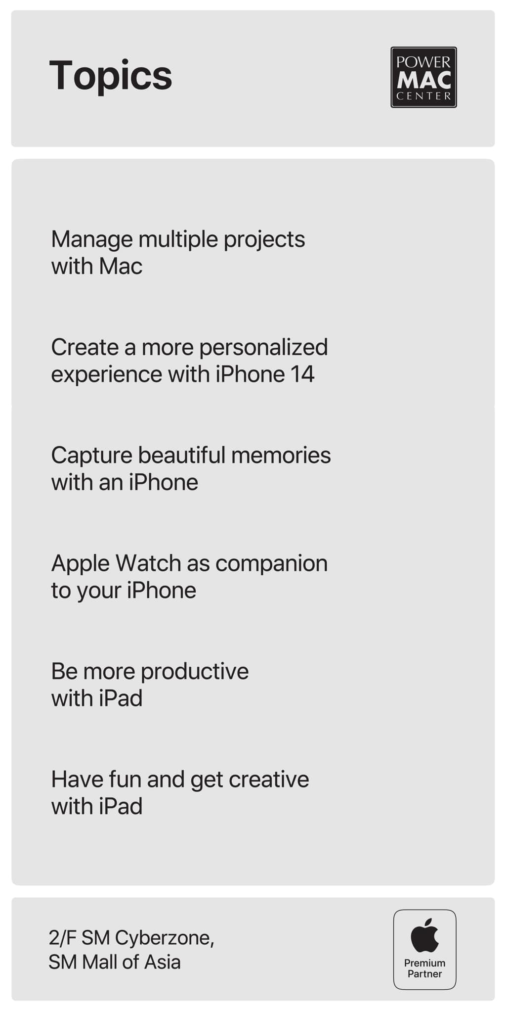 Starting on June 30 onwards, the Power Mac Center SM MOA Apple Premium Partner store will be offering in-store group demos daily at the selling area absolutely free for everyone.