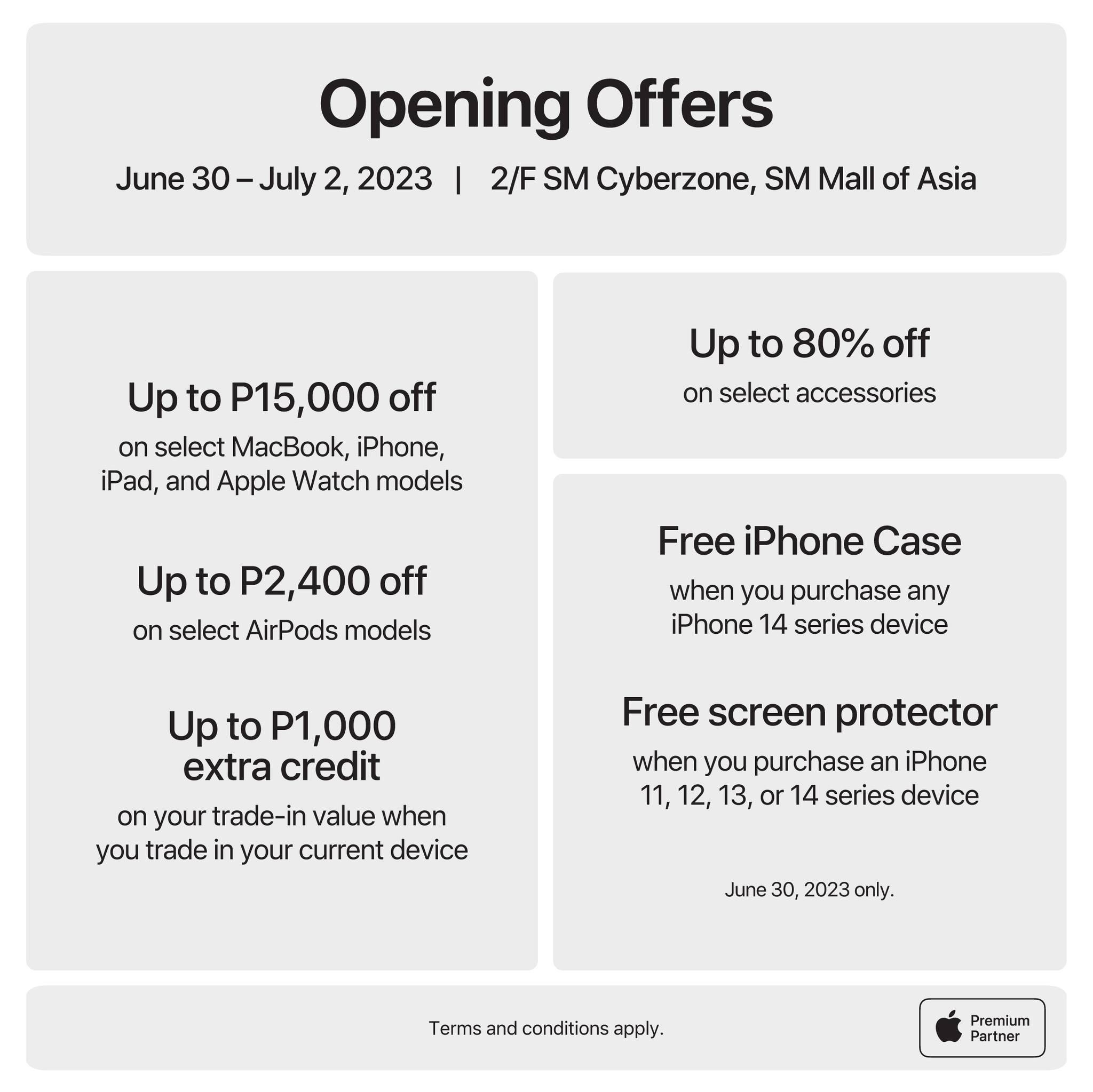 Everyone is invited to come celebrate the SM MOA APP store opening and take advantage of huge deals and discounts! Special offers on Apple devices, accessories, and services are available during the entire opening weekend (June 30-July 2, 2023), including the following: